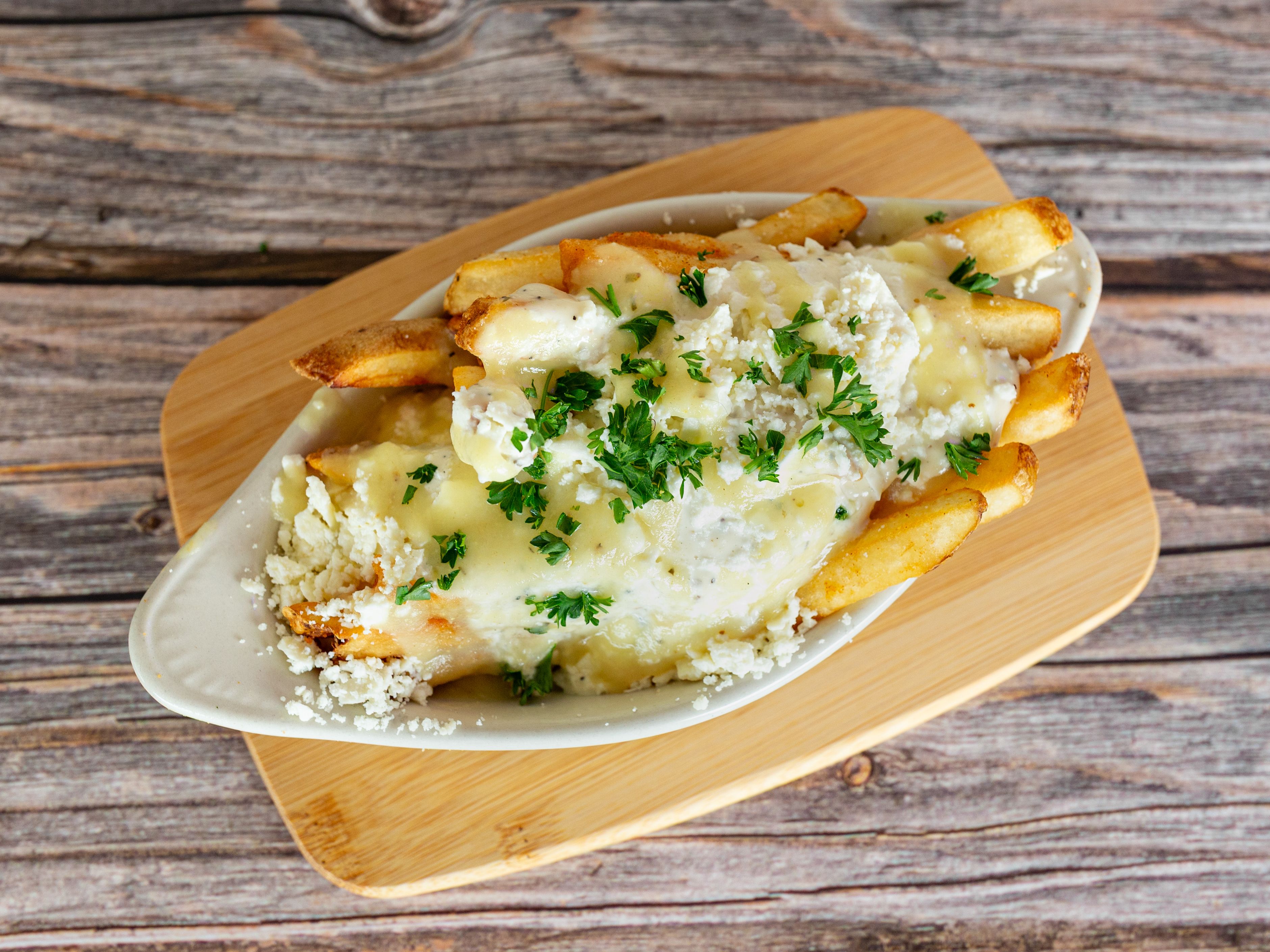 Choice of Protein on Fresh Cut Fries, with Crumbled Feta, Parsley, and Parmesan, with Housemade Garlic Sauce.