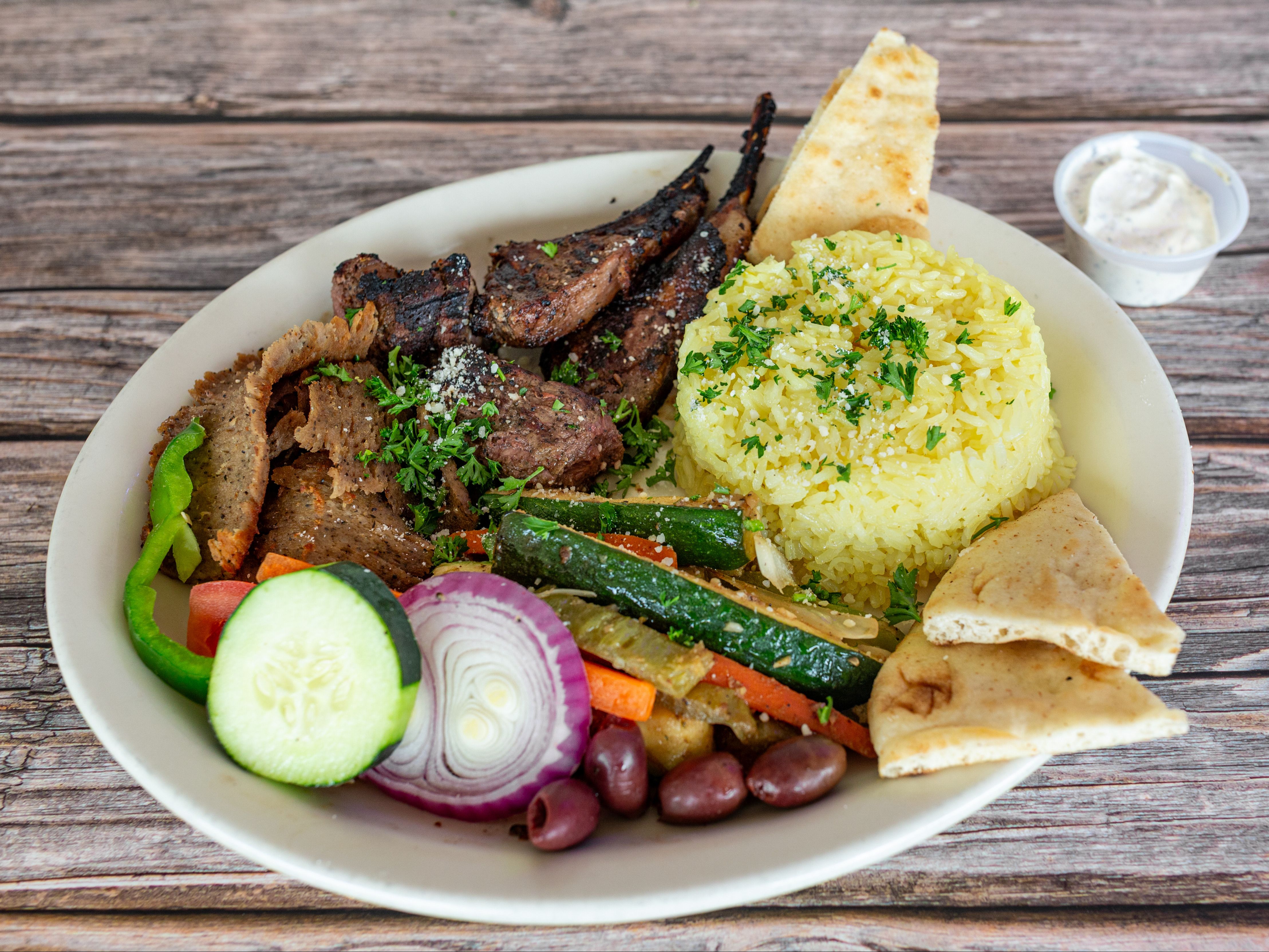 A bold mix of lamb kabob, lamb gyro, and lamb chops—grilled, sliced, and flame-seared to perfection. Served with rice, sautéed vegetables, pita, and housemade garlic sauce.