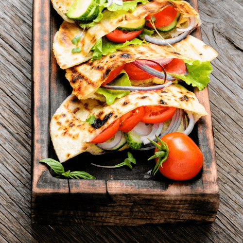 A warm Pita filled with Roma Tomatoes, Banana Peppers, Lettuce, Cucumbers, Red Onion, and Housemade Garlic Sauce.
