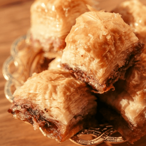 A bite-sized portion of our flaky filo pastry filled with sweet walnuts, honey, and syrup. The perfect finish!