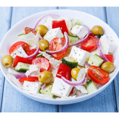 Fresh mixed greens topped with cucumber, tomato, red onion, green peppers, carrots, pepperoncini, olives, and crumbled feta cheese.