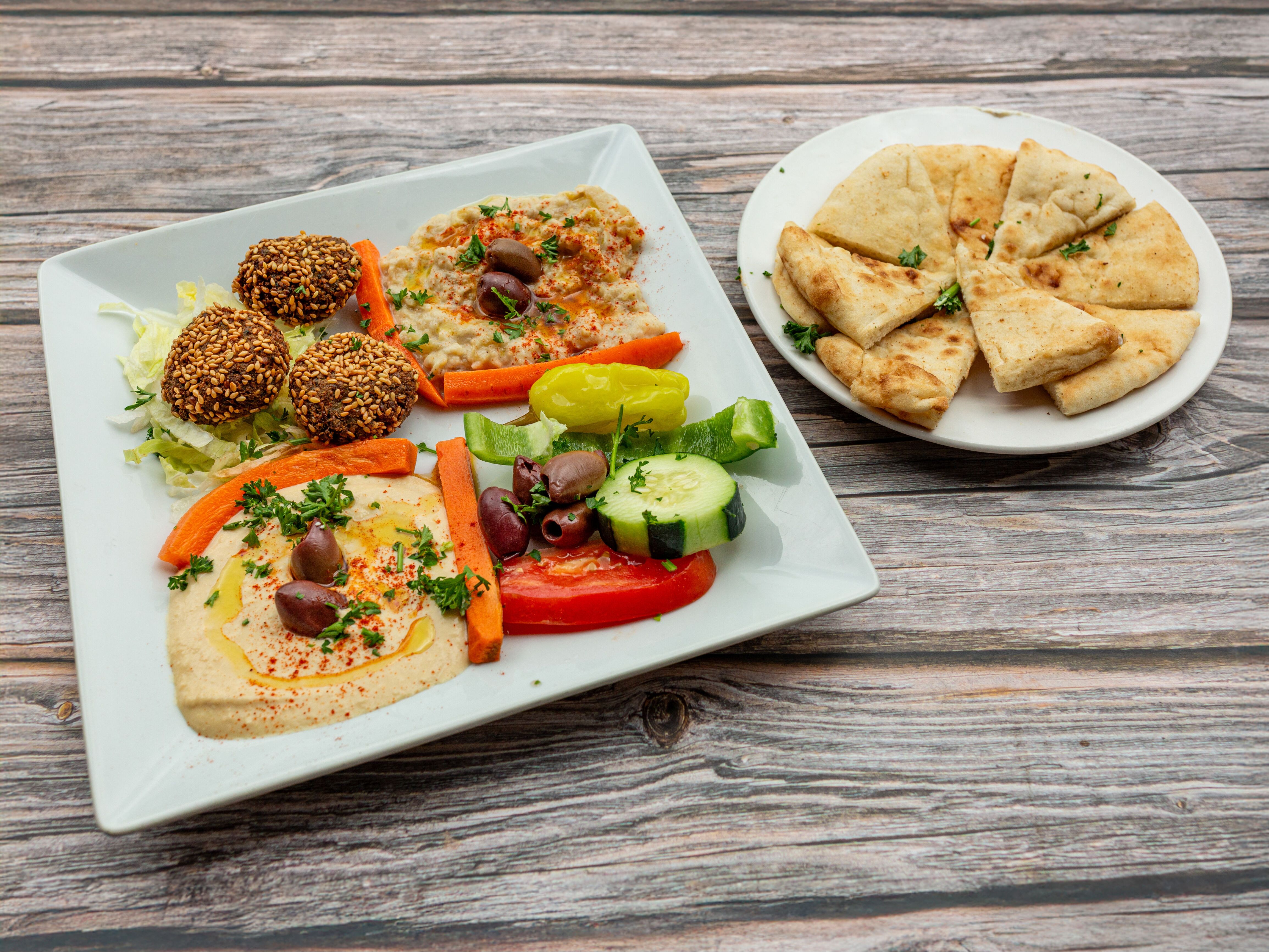 A combination of hummus, falafel, and baba ghanoush, with crisp fresh vegetables. Served with pita.