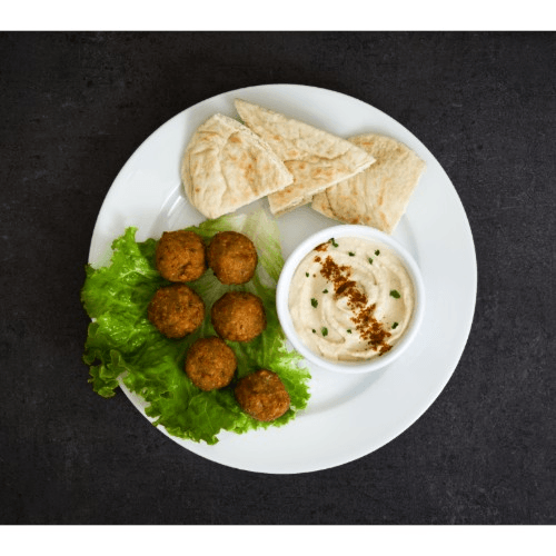 Six crunchy, deep-fried chickpea patties, coated in sesame seeds with herbs and spices.